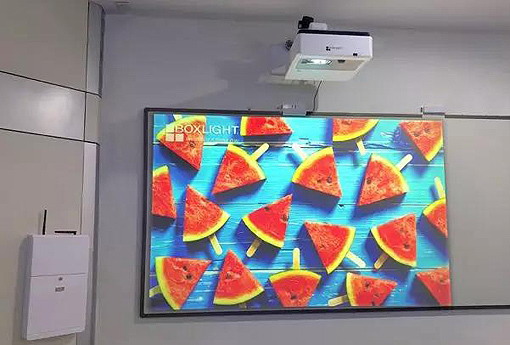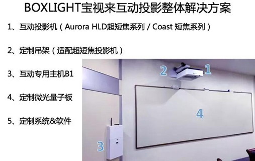 BOXLIGHT寶視來推出的護眼互動投影整體解決方案,顛覆性地淘汰了傳統的黑板和綠板,改變了以往幾十年用粉筆寫字的歷史,微光量子板一板三用(代替黑板、幕布、電子白板)由水性筆書寫,清水擦拭,無塵、無毒、無味,保障師生身心健康及延長設備使用壽命,讓教室進入一個低碳環保的教學新環境。