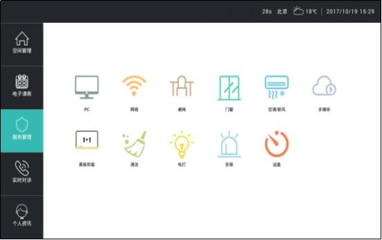 服務內容可根據用戶自定義添加(如PC、網絡、桌椅、門窗、空調/新風、黑板和筆、清潔、電燈、安保、巡查等內容)。