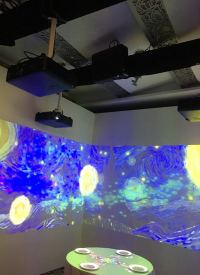 現場用一臺5000流明、全高清1080P的明基激光工程投影機LU950單臺投影到桌面,除了基本的餐具,絢麗的全息畫面完全倚賴上方的投影機,定制片源點對點投映餐桌及餐具,再利用3D投影映射技術和動作捕捉技術,將餐桌布置成一場趣味表演秀的“舞臺”。