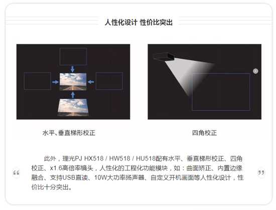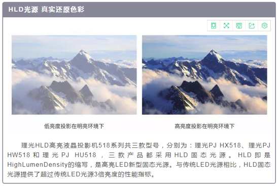 采用了HLD LED光源的理光518系列產(chǎn)品,其中理光PJ HX518可投射5200流明亮度、理光PJ HW518和理光PJ HU518最大輸出亮度可達5000流明,擁有2,500,000:1的高對比度,光源壽命高達20,000小時,因此在投影機使用生命周期內免除了用戶更換光源的問題,節(jié)省了大量成本。