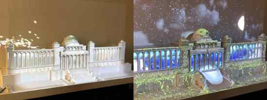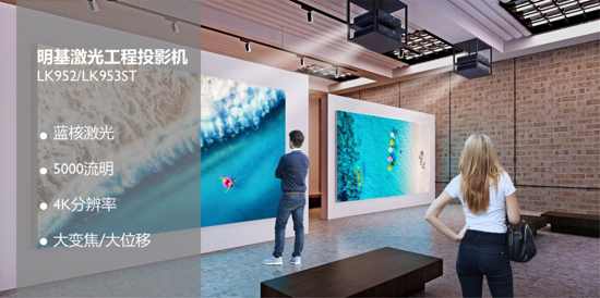 3D Mapping投影主要透過音視頻特效還原呈現(xiàn)。在會議現(xiàn)場,展示的是一個縮小版建筑立面模型的mapping,使用LK953ST投影機,該機型達到亮度5000lm,分辨率3840*2160,投射比0.8,支持大范圍鏡頭位移,在實際應用中可通過拼接融合的方式實現(xiàn)真實建筑立面的mapping投影秀,這樣的方案目前已廣泛應用于主題樂園,博物館,展覽館,規(guī)劃館等,打造出壓軸級別的樂園沉浸式項目。