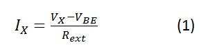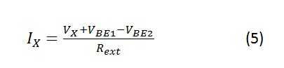 Q1晶體管的基極連接至程控電壓源。發(fā)射極經(jīng)由一個串聯(lián)電阻器RS連接至另一個正電軌,并且集電極接地。這樣便可以在晶體管的發(fā)射極形成一個VX + VBE電壓。Q2晶體管的發(fā)射極通過電阻器RX連接至Q1的發(fā)射極。RX設(shè)置導(dǎo)入FB節(jié)點(diǎn)的電流。基極接地后,Q2發(fā)射極節(jié)點(diǎn)產(chǎn)生一個+VBE。等式5計算了流至發(fā)射極的電流(理想情況):
