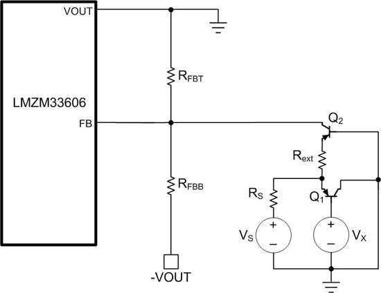 在這些降壓-升壓應(yīng)用中使用LMZM33606時,可以實(shí)現(xiàn)-15V至-5V的可編程輸出電壓范圍。通過電流源方法,您能夠以絕對量級調(diào)低穩(wěn)壓器的輸出。這樣,在設(shè)置反饋分頻器電阻器時,便可以將設(shè)計的默認(rèn)輸出設(shè)為-15V。添加外部電流源時,您可以將穩(wěn)壓器輸出設(shè)置為-5V。默認(rèn)輸出為-15V時,計算的高反饋值和低反饋值分別為: