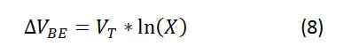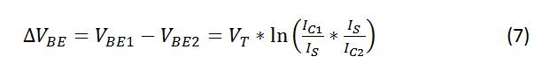 如果兩個晶體管的集電極電流差異較大,則VBE不會完全彼此抵消。等式7闡述了晶體管兩個VBE之間的差異: