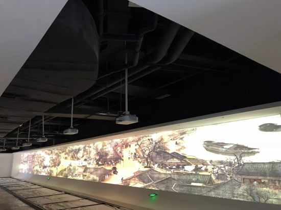 依托“詩畫開陽”的豐富旅游資源,為了讓參觀者全面了解開陽本地十里畫廊景區特色文化,展廳借助10臺NEC CF6700X(5800流明亮度、1024×768分辨率)高端商務液晶投影機做融合,在30米的高清軟膜幕布上投射瑰麗的超寬幅影像,整幅畫面可達10240×768的高分辨率。