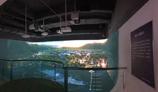 開陽在發展智慧旅游的同時,還搭上了貴州大數據崛起的“順風車”。為進一步提升參觀者對大數據實際應用的直觀了解和感官體驗,“數谷小鎮”展廳利用8臺NEC CR5450W(4500流明亮度、1280×800分辨率)多方位、多角度吊裝,使三面墻體和地面沙盤融合成為一個沉浸式投影畫面。