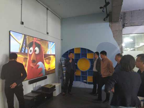 在庫帕展廳,庫帕總經(jīng)理謝源先生向副市長一行簡要介紹了第三代激光電視產(chǎn)品,120英寸大畫面,3米視距下無壓迫感,無輻射,是真正健康護(hù)眼的未來影院顯示產(chǎn)品。