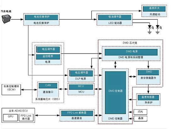 基于DLP技術的系統使用額外的傳感器輸入,關閉投射到對向車輛擋風玻璃上的前照燈部分,以免眩光對駕駛員造成不適或引起分心。前照燈系統中使用DLP技術后,可以對像素化的前照燈光束進行精細化控制,從而實現自適應遠光功能,有助于提高夜間駕駛時的視野和舒適度。圖3顯示了在前照燈系統中采用DLP芯片組的系統框圖的示例。