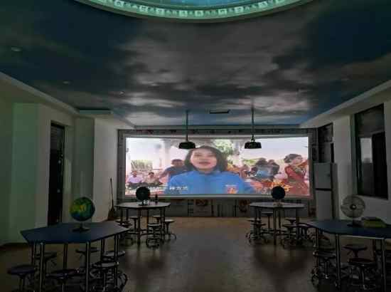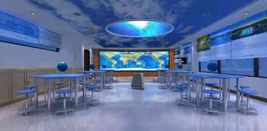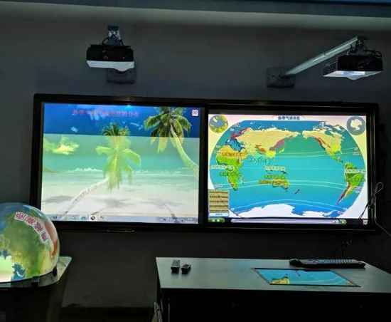 授課方式不一樣 在羿飛地理專用教室,教師通常運用教室后方的巨大投影屏幕即環幕示教系統和天花板上的天文演示穹頂播放課程相關視頻,開啟整堂課。并在課程中穿插使用,幫助學生加深理解。位于教室前端的數字立體地形,解決了地理老師上課頻繁更換各類地圖甚至需手繪地圖的問題。它將三維地形模型和虛擬數字影像融合,并可以在立體模型上進行動態演示,如冷暖鋒相遇在江南地區形成梅雨的過程等,打破傳統地理單一的模型教學效果。