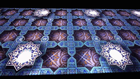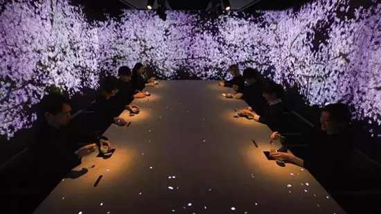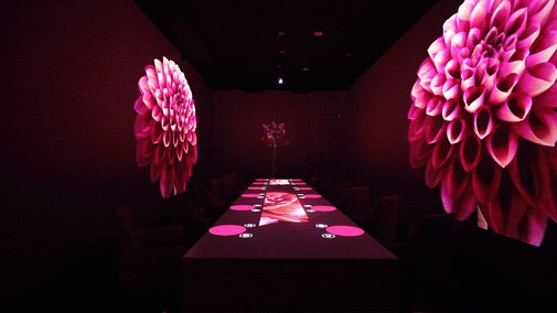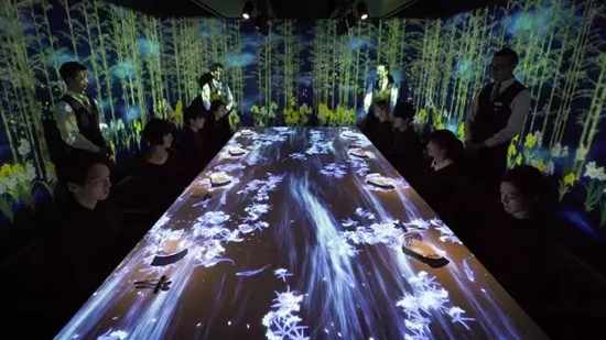日本 teamlab藝術團隊在東京銀座區創建的一間沉浸式交互餐廳。裝置名為“釋放世界并相互連接”。為就餐者提供包含味覺、嗅覺以及日本美景在內的獨特的全方位感官體驗。鋪著帆布的餐廳墻壁與餐桌都是投影的幕布。當一盤食物放在桌上時,食物中包含的景觀世界便會被釋放,在餐桌上展開并蔓延至周圍空間。