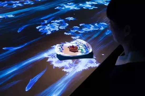 設計師這樣說道,“例如,投影展示中,餐盤上描畫的鳥能夠騰空飛起,停留在從另一餐盤中釋放出來的樹的枝頭上”。被投射物品的尺寸與形狀也受到桌上其他餐具的影響,創造出一種不斷變化的環境,用來展示日本不斷變化的季節。投影圖像還會受到就餐者行為的影響,“當就餐者靜止不動時,投影中的小鳥可能會停留在食客的手上,而這時如果突然動一下,小鳥就會飛走”。