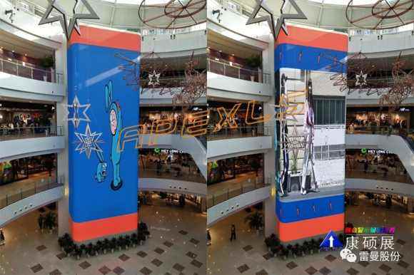 位于5號大廳的縱向LED異形屏,高度接近20米、寬度近5米,這是一塊包圍在大廳上下四層升降電梯外圍的三面屏,采用了弧形設計,屏體正面和兩側的銜接處均采用了康碩展單獨開模的特殊單元板,整體線條流暢過渡、無縫拼接。