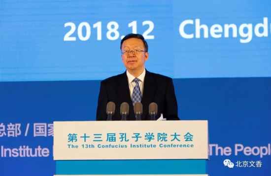 中共四川省省委書記彭清華致辭,他代表省委、省政府向出席大會的各位嘉賓表示歡迎。他說,孔子學院在推動世界各國“民心相通”中發揮著重要作用,越來越成為中外語言文化交流的窗口和橋梁。四川是華夏文明的發源地之一,有文化的基因和興教的傳統。近年來,我省堅持傳承弘揚中華優秀傳統文化,鼓勵支持四川學校在海外建立孔子學院,以學院為“媒”、以語言為“橋”,積極推進教育對外開放,深化與世界各國的交流合作。下一步,我們將一如既往重視支持孔子學院建設,大力推廣漢語言文化,促進各類人才交流交往,推動中國文化、巴蜀文化走出去。
