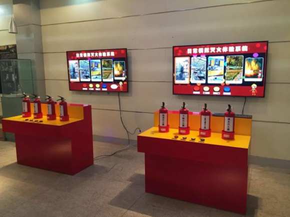 滅火實(shí)訓(xùn)系統(tǒng) 是以滅火器實(shí)物和電視機(jī)播放聯(lián)動(dòng)的形式展示。滅火器實(shí)物經(jīng)過(guò)改造安裝信號(hào)識(shí)別設(shè)備,根據(jù)電視播放的多媒體內(nèi)容,學(xué)生選擇相應(yīng)的滅火器進(jìn)行滅火。