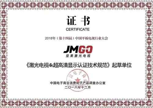 12月17日,由中國電子商會(CECC)、中國電子技術標準化研究院(CESI)共同主辦的"2018年(第十四屆)中國平板電視行業大會"在北京召開。CESI聯合激光電視行業頭部品牌堅果共同起草并發布了《激光電視4K超高清顯示認證技術規范》,進一步強化激光電視產品和市場規范。