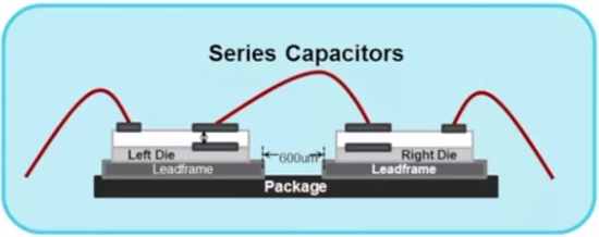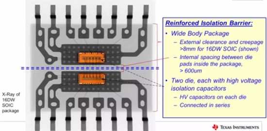 這是一個寬體封裝。在封裝內部,兩個裸片墊之間有一個較大的內部間隙,該間隙超過了600微米。每個裸片都有高電壓電容器。這是一個三通道隔離器,每側均有六個電容器。