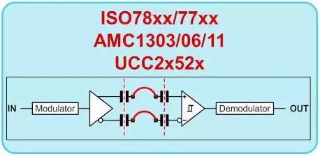 在上面的剖面原理圖中,您可以看到,左右兩側各有一個裸片,且它們都有一個高電壓電容器。而且它們是串聯的。隔離電容器組合厚度大于21微米。數據在傳輸過程中會穿過該隔離層,如下圖的原理圖所示。信號傳入、接受調制、穿過差分電容器對的隔離層、解調,然后傳出。