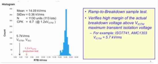 在上面的直方圖中,是我們對來自113個批次的1,130個器件進行緩升至擊穿電壓測試所得到的數據。您會看到,平均擊穿電壓高于14kVRMS。這要比額定隔離電壓5.7kVRMS高得多。一種較好的用于判斷該性能高出了多少的方法是CPK指標。CPK為1表示該數據高于隔離要求3sigma。CPK為2表示該數據高于隔離額定值6sigma。您可以看到,該數據集中具有大于6的CPK。該CPK是在生產測試條件下測得的,比隔離額定值高20%。該數據表明,TI的增強型隔離產品系列具有超出增強型隔離要求的高電壓能力。