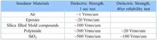 我們選擇二氧化硅作為我們的電介質,是因為它具有非常出色的可靠性。在下表中,我們對隔離產品中有時會使用的一些電介質進行了比較。