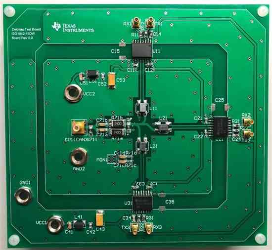圖1是EMC測試用電路板的示例。電路板具有三個連接至同一總線的隔離式CAN收發器。在測試點(圖1的CP1)進行發射測量,其中一個收發器發射50%占空比、250 kHz的方波信號。