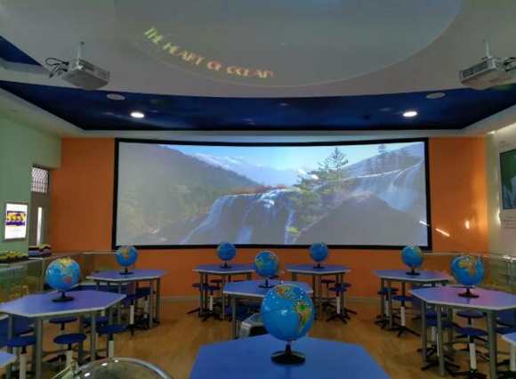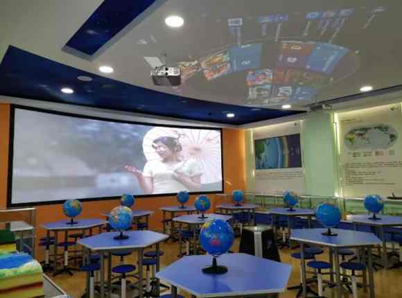 位于教室后方的是一塊幾乎占據整個墻面的大屏幕,名為環幕示教系統,顧名思義,以視頻進行示范教學。在教學實踐中,教師使用超大屏幕播放相關視頻,激發學生學習興趣,引導課程進度。與天花板上的天文演示穹頂相輔相成,將學生全方位地包裹進地理學習的情境之中。