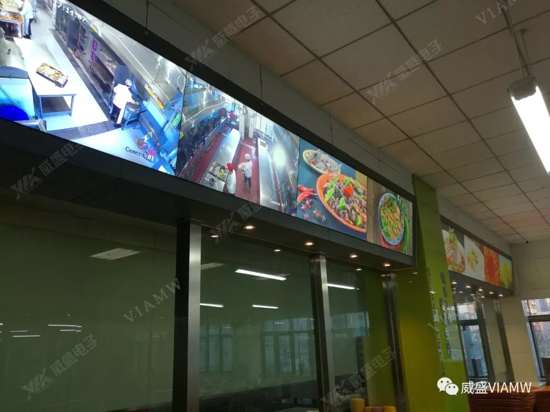 該項目主要分三個顯示區域,一樓位置共有1*19個顯示終端,二樓位置共有1*12個顯示終端,另外一個區域為1*8的顯示終端。整個項目共有41個DC4000解碼盒連接每一塊顯示屏,僅用一臺多屏媒體服務器控制,使用VIA威極分分布式系統架構實現顯示系統的播放,屏幕顯示食堂的食譜,菜單等。同時還可以分屏顯示廚房監控的畫面,讓消費者可直觀看到廚房菜品的切配烹飪、餐飲具消毒等。