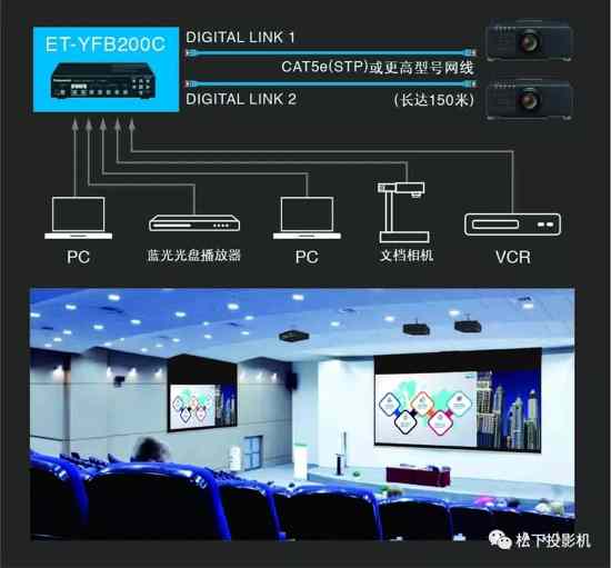 投影機在大型場館安裝時,往往因為場地過大、傳輸距離過遠而影響信號和圖像的傳輸效果。為應對長距離傳輸全高清圖像的課題,松下基于HDBaseT TM協議,DIGITAL LINK可通過一根CAT5e(STP)或更高型號網線,傳輸非壓縮全高清視頻和控制信號長達150米。使用選配件高清數字傳輸盒,可使大型場館內投影機的安裝更為簡便,同時降低使用成本,提高可靠性。