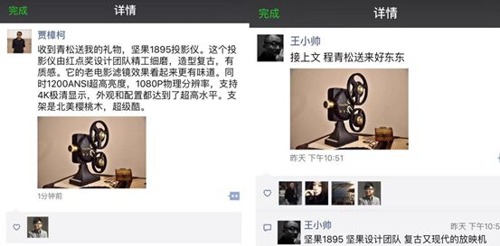 堅果1895為致敬電影,特別還原了老式電影放映機的造型,外觀復古而有韻味,如同一件精致的收藏品。這樣的特性,也讓堅果1895一經推出就受到了影視圈的關注。堅果智能影院投資人、著名演員黃曉明先生在堅果1895上市之初就十分豪氣地下單定制200多臺專屬銘牌機用以贈送給影視圈的朋友,其中也包括《芳華》、《天下無賊》等優秀電影的導演馮小剛。