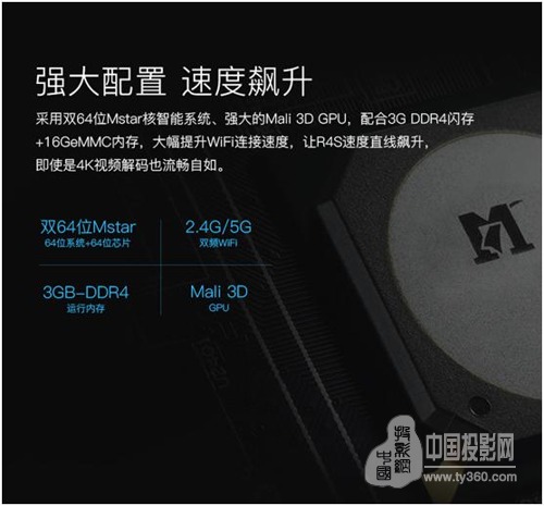 配置上,酷樂視R4S采用全新64位MSTAR核智能系統和Mali3D GPU的視頻處理器,支持3D/4K,搭載3GB的DDR4RAM,在同等內核頻率下速度是DDR3的兩倍, 16GeMMC的存儲相比同類4G、8G的存儲性能更強,支持上下左右四向梯形校正、1.2投射比、光學調焦、自動聚焦、無線同屏以及HDMI、USB等常用接口。