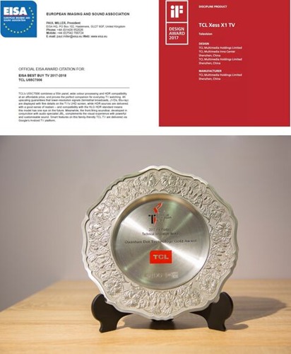 憑借著過硬的產品實力,TCL電視贏得了市場口碑的雙豐收,在2017年里獲得了累累榮譽。2017年1月CES上,TCL將“中國消費電子領先品牌10強”、“全球消費電子50強品牌” 和“全球TOP20電視品牌“收入囊中,其量子點子電視則榮獲“年度全球顯示技術創新獎”;TCL X1/X2量子點電視榮獲2017 iF設計大獎;TCL 55C2(歐洲同款型號TCL C70)獲EISA 2017-2018年度 Best Buy TV 大獎 ;9月IFA德國柏林消費電子展上,TCL X6 XESS 私人影院榮獲量子點顯示技術金獎;12月“2017中國好電視發布會”上,X6 XESS私人影院獲得“年度高端旗艦電視獎”,X3 原色量子點電視獲得“年度熱門暢銷電視獎”,X2 原色量子點電視獲得“年度網絡人氣電視獎” ,C5都市藍調電視獲得“年度優秀人工智能電視獎“,P6超清薄電視獲得“年度超高性價比電視獎”。