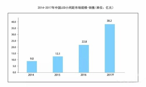 隨著LED小間距顯示屏在演播室、安防監控、交通指揮中心、大型視頻會議室等專業顯示市場滲透率的快速提升,P2以下的LED小間距顯示屏市場規模近年來保持了高速的增長。據奧維云網(AVC)顯示器件與系統大數據顯示,2016年國內小間距LED顯示行業銷售規模達22.8億元,并加速向高端大屏領域滲透。預計2017年全年國內市場銷售總額持續增長,有望達38.2億元,增長率在60%以上。
