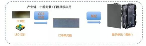 為了解決SMD分立器件小間距顯示屏技術路線的瓶頸,目前業界提出了COB(Chip On Board)封裝小間距顯示屏技術路線。COB封裝是將LED芯片直接固晶焊線在帶顯示電路的PCB板上,再用封裝膠對LED芯片包封。雷曼的COB小間距LED集成顯示所在的產業鏈及技術路線如下圖所示: