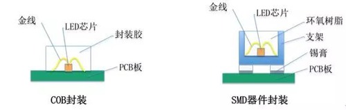 COB封裝與普通SMD器件封裝相比,COB封裝取消了LED支架,以及通過SMT回流焊由錫膏連接PCB板的環節。COB封裝中,直接將LED芯片固晶、焊線在PCB板上,用封裝膠直接將LED芯片包封在PCB板上。因此,COB封裝具有更高的可靠性。