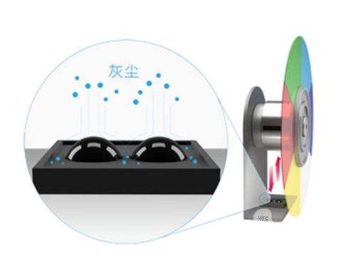 色輪處于投影機內部半封閉位置,即使濾網阻隔住多數灰塵,一小撮“漏網之魚”仍會入侵內部,伺機附著色輪表面,令成像效果大打折扣,這樣的話即使光源正常,畫面質量的迅速衰減也會造成使用困難。具體影響有三: