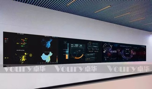 在 “為網絡安全服務而生”的云天安全,Voury卓華P1.6 微間距LED顯示拼接大屏幕,保持了一貫對高品質的堅持:擁有不低于3840Hz的刷新頻率,這個數字不僅超過了DLP和LCD顯示屏的刷新屏率,(后兩者的刷新屏率只有大約120Hz),而且在同類產品中也是一個高品質的象征。