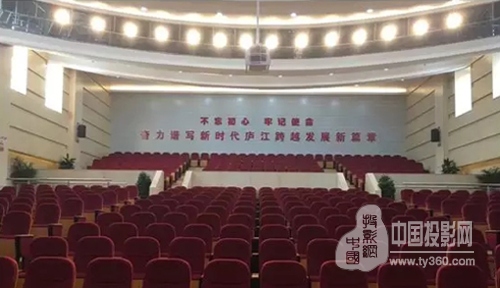 多功能禮堂面積700平米,觀眾席呈階梯形式,有可容納4排階梯桌椅、50個座位的主席臺,從規?磻獙儆诖笮蛨蟾鎻d。大廳的舞臺配置了一幅300英寸屏幕,盡管環境光可以控制,按照設計標準應選擇一萬以上流明度的投影機,在用戶權衡了單機高價位,疊加低價位的利弊之后,選擇了日本佳能LCOS投影機:WUX6010,該機具有6000流明彩色亮度,兩臺疊加后具有12000流明彩色亮度,這種疊加的使用方式不僅降低了成本,還帶來了系統冗余備份的功能。佳能WUX6010是2017年推出的機型,使用了佳能最新的光學系統、光學引擎、圖像處理,代表了佳能的最新技術。