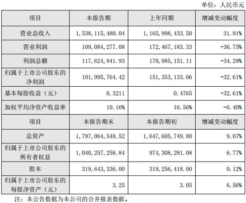 報告期內(nèi)公司實現(xiàn)營業(yè)總收入1,538,115,480.04元,比去年同期增長31.91%;營業(yè)利潤109,084,277.08元,比去年同期減少36.75%;利潤總額117,624,941.93元,比去年同期減少34.28%;歸屬于上市公司股東的凈利潤101,995,764.42元,比去年同期減少32.61%;基本每股收益0.3211元,比上年同期下降32.61%;加權(quán)平均凈資產(chǎn)收益率為10.16%,較去年同期減少6.40個百分點。