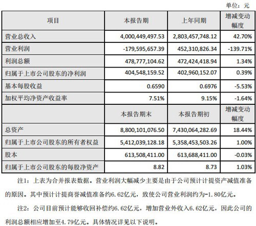 報告期內公司實現營業總收入4,000,449,497.53元,同比增長42.70%;實現營業利潤-179,595,657.39元,同比減少139.71%;利潤總額478,777,104.62元,比上年同期增長1.34%;實現歸屬于上市公司股東的凈利潤403,275,444.28元,比上年同期增長0.60%。報告期內公司基本每股收益為0.6590元,比上年同期減少5.52%,F對上述相關財務指標的變動說明如下:
