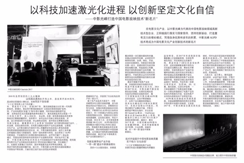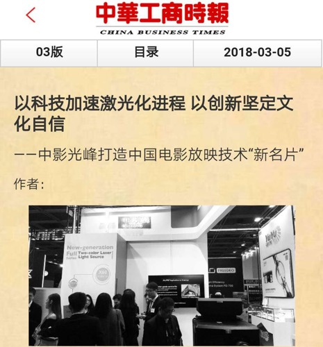 都說科技是國之利器,其實也是電影行業(yè)的利器,中影光峰運用先進的科技手段,為中國電影產(chǎn)業(yè)打開一扇新的大門。兩會伊始,當電影產(chǎn)業(yè)毫無疑問再次成為大家熱議的話題時,作為國內(nèi)ALPD®激光放映技術的先驅(qū),3月5日,中華工商時報在兩會會刊上對中影光峰進行了一次深度報道,高度肯定中影光峰憑借科技創(chuàng)新對中國電影產(chǎn)業(yè)發(fā)展帶來的推動,并成為中國向電影強國邁進道路上的有勁基石。
