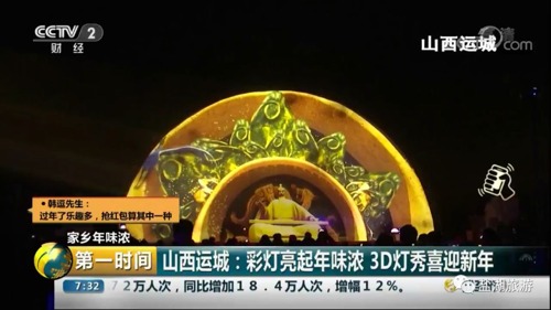 當然最受矚目的還是3D激光投影主題展示,將傳統的德孝舜帝、忠義關公等河東文化,利用現代激光顯示技術,完美逼真地呈現在觀眾眼前,不僅讓各位游客在歡天喜地的春節期間感受一場真正的視覺盛宴,也向全國展示了“古中國·大運城”的不俗顏值和文化底蘊。