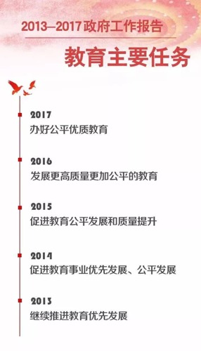 近年來,教育公平越來越受到國家層面的重視;仡欉^去5年,政府工作報告的教育主要任務如下圖: