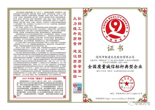 堅持對品質的執著可謂是聯建光電成長為LED顯示知名品牌的關鍵,公司自成立以來,始終堅持“質量是企業生命”的至臻信條,嚴格執行ISO9001:2000質量管理體系,建立了獨有的設計、生產、安裝到服務全過程的質量控制和管理體系,打造了包括產品評審制度、原材料進廠檢驗制度、制程檢驗制度、出廠檢驗制度、產品追溯及服務制度等在內的上百道工序和檢測,以極為嚴苛的品質管理體系鑄造軍品級的LED顯示屏品質。正是這份堅持,讓聯建光電得到了市場的認可,歷年來斬獲多項殊榮,包括“深圳市知名品牌”、“廣東省守合同重信用”,于2017年獲得中國質量檢驗協會頒發的“全國LED顯示屏行業質量領先品牌”、“全國質量誠信標桿典型企業”、“全國質量檢驗合格產品”及2018年“全國產品和服務質量誠信示范企業”、“全國質量信用先進企業”稱號以及其他獎項殊榮;公司先后獲得安全生產許可證、鋼結構施工資質、系統集成資質并通過國軍標質量管理體系認證。這些榮譽既是對聯建光電的肯定,也是對未來聯建光電追求更高品質的鞭策與激勵。