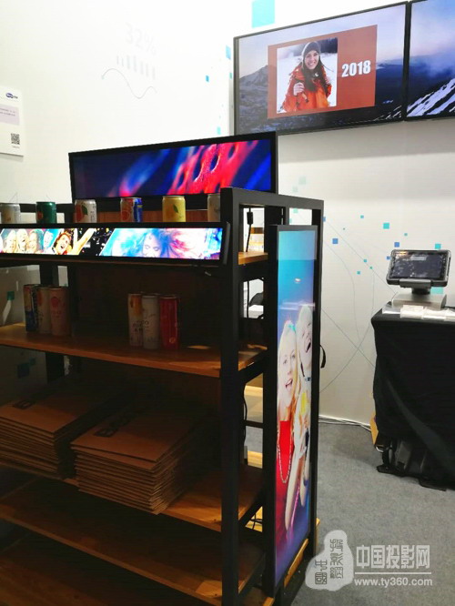 6平米的展位,位置不大卻五臟俱全,既看得見(jiàn)豐富多樣的顯示硬件,透過(guò)內(nèi)容還能對(duì)智能軟件應(yīng)用窺知一二。其中播放精彩內(nèi)容的智能貨架最為矚目,區(qū)別于我們平常看到的貨架,緊貼商品擺放的條形屏能夠提供更多商品信息,還能增加品牌曝光。