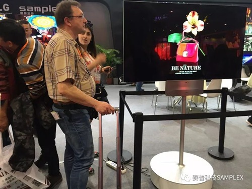 精美且輕薄的OLED屏在數字標牌領域的應用也被普遍看好。現場代表性展出了一款55寸雙面平面顯示器,其不僅擁有對比度極高,色彩表現力極強的畫質,更支持落地、吊頂、靠墻等三種靈活的安裝方式,為賽普科技圈粉無數。主要應用于室內店鋪,面窗顯示,手扶電梯等場景。