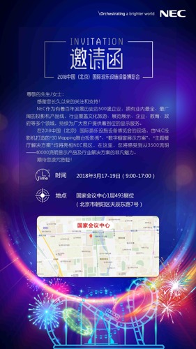 3月17-19日展會(huì)期間,現(xiàn)場(chǎng)將展示多款產(chǎn)品及解決方案,期待您撥冗蒞臨國(guó)家會(huì)議中心1層493展位,共享NEC投影的魅力!