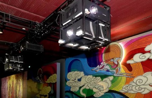 在國家大劇院內,通過42臺視美樂8500流明近焦投影機將一百五十多米長的石窟壁畫呈現于特制墻體之上。通過3D投影、全息技術、VR動捕技術等各種新技術的應用,長卷徐展、歷史再現。這種數字展演不僅是文化的傳承,也是最好的保護和再創造——它給予了已經消失的文化,無限流動的新生命。