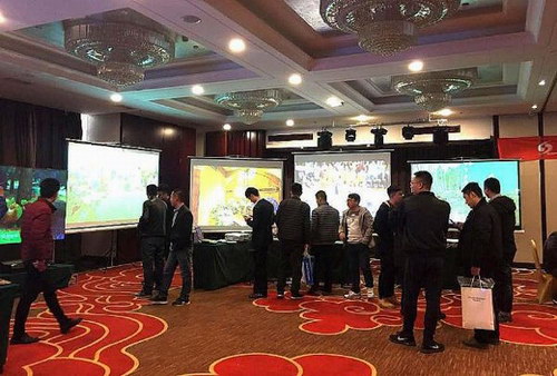 會議現場展出了HLD新光源投影機,以及“雙通道融合投影”、“畫中畫”、“miracast無線投影”、“互動游戲投影”、 “紗幕投影”、 “編播前后期一體化”等多種視頻影像解決方案,吸引現場不少客戶駐足觀看。