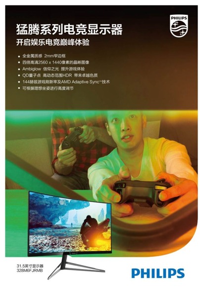 同時,飛利浦猛騰系列電競顯示器278M6FJMB和328M6FJMB 都配備144赫茲刷新率 ,可輕松實現每秒將屏幕圖像重繪144 次,搭載AMD顯卡配合AMD FreeSync?技術,帶來更流暢清晰的游戲畫面。飛利浦猛騰系列顯示器還有其獨家Ambiglow流光溢彩技術 ,產生令人沉醉的燈光,能讓玩家瞬間進入各種游戲角色,加上1 800R的完美曲率 ,在操作的同時帶來影院般的沉浸式體驗,將游戲競技變為享受的過程,超越了傳統意義上的“玩”。