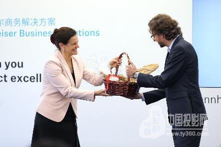 北京德國(guó)中心董事總經(jīng)理 Ruth Schimanowski女士為森海塞爾全球 CEO Daniel Sennheiser先生送上面包籃,對(duì)森海塞爾遷入北京德國(guó)中心表示祝福
