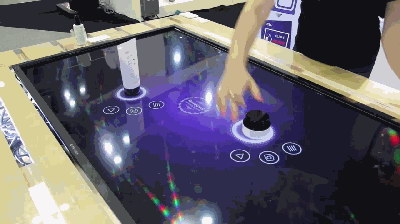 在2018年3月中國家電及消費電子博覽會展會期間,投石科技為四季沐歌提供了55寸物體識別甩屏觸摸桌的租賃服務。該項目就是采用人機交互設備,圓形物體觸摸識別桌。
